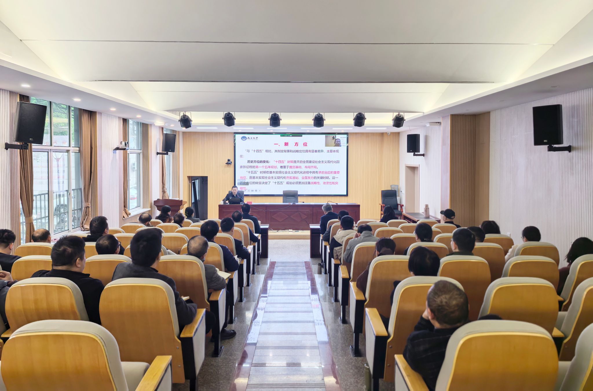 会议邀请南昌大学中国特色社会主义理论体系研究中心主任胡伯项教授以《夯实基础、全面发力,在接续奋斗中确保基本实现社会主义现代化取得决定性进展》为题作专题授课。胡伯项在授课中围绕深入学习宣传贯彻党的二十届四中全会精神,从深刻认识全会确立的“新方位”、准确把握全会提出的“新要求”、全面落实全会作出的“新部署”三个方面,对“十四五”时期我国取得的重大成就,以及“十五五”时期我国经济社会发展的指导思想、基本原则、主要目标、战略任务进行了深入解读,并对如何紧密结合实际学习贯彻全会精神提出了指导性意见。