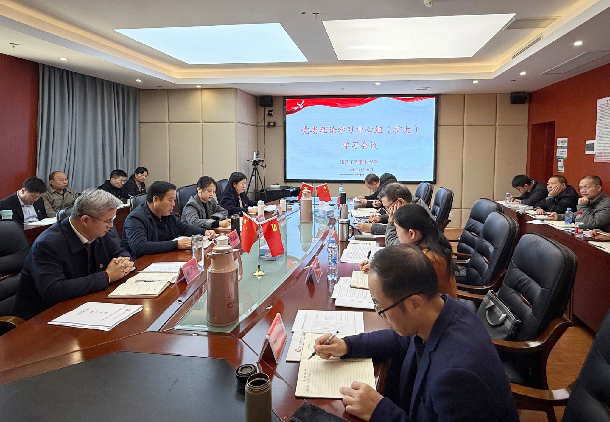 11月21日上午,学校召开2025年党委理论学习中心组第十二次学习(扩大)会议,专题学习贯彻党的二十届四中全会精神。江西建设职业技术学院党委委员、副院长李淑林,党委宣传部负责人罗瑶列席会议。学校党委书记花严红主持会议。