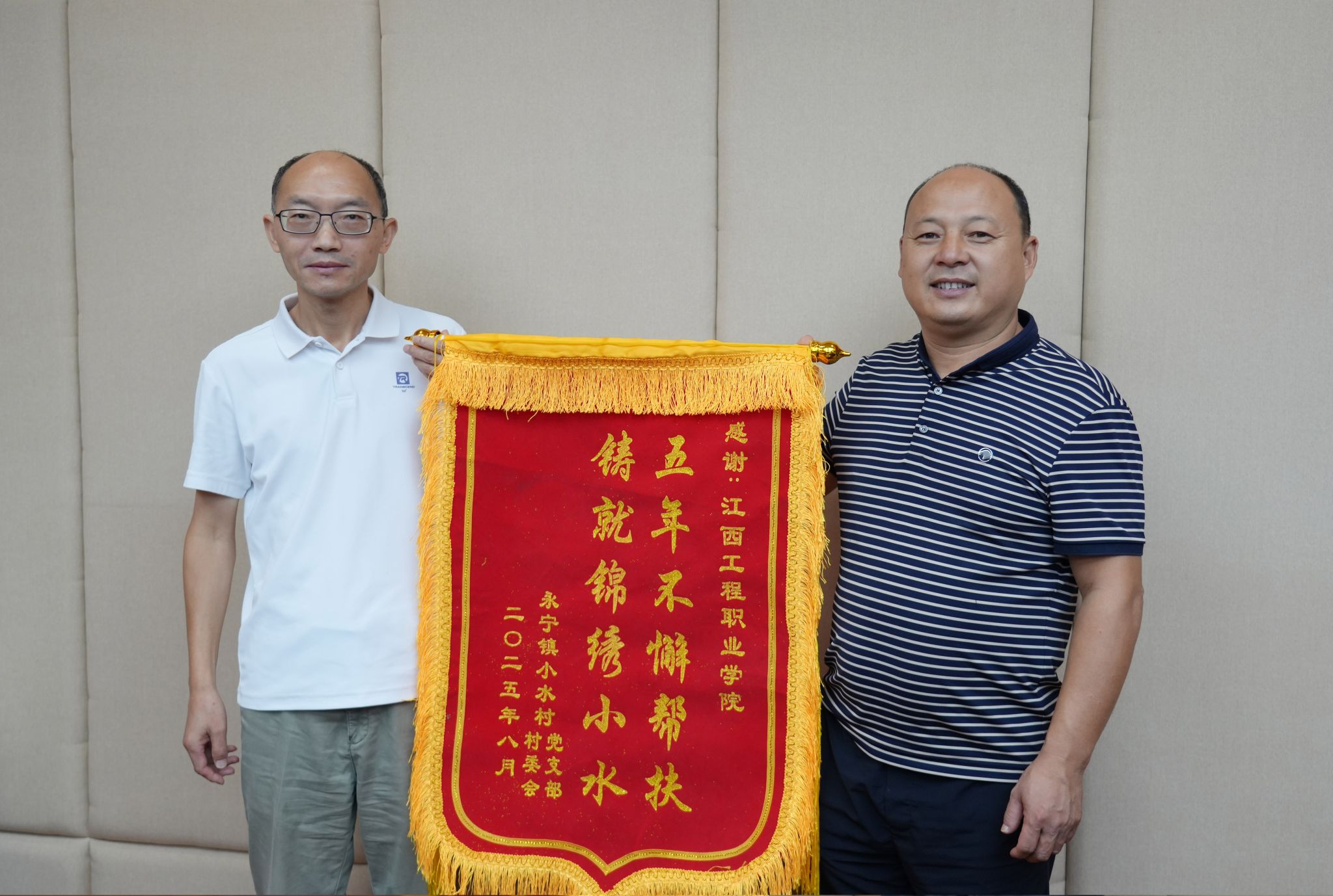 三面锦旗,承载着校地之间的深厚情谊,充满了对帮扶工作的肯定与鞭策驻村工作队队员们用辛勤的汗水、真诚的奉献,换来了小水村村民对他们的认可,诠释了党员践行为民宗旨的深刻内涵。下一步,学校将持续发挥优势,聚焦乡村发展需求,以更务实的举措、更优质的服务助力新时代乡村振兴,为乡村振兴贡献更多学校力量。