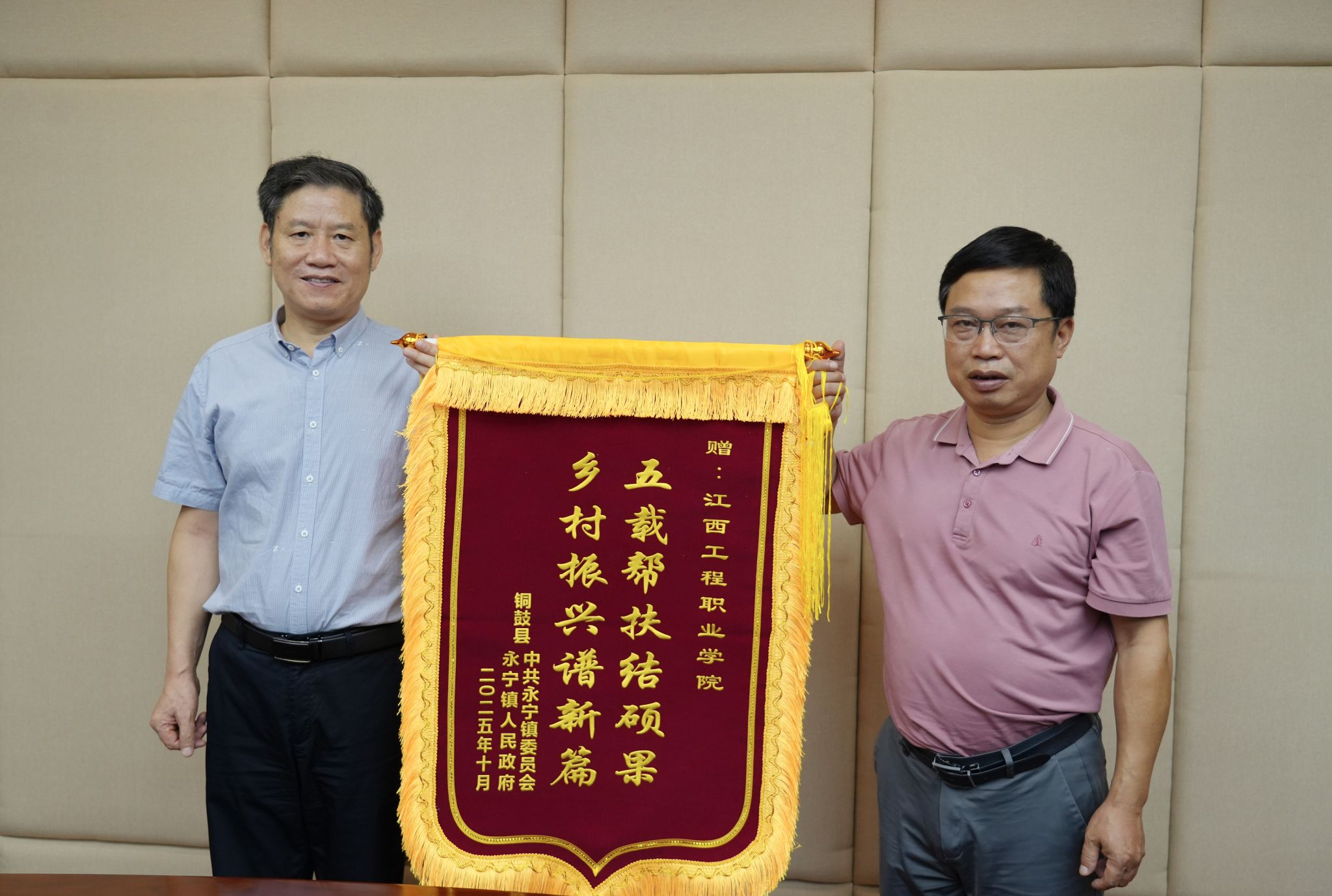 近日,宜春市铜鼓县永宁镇党委委员、副镇长李乔强,小水村党支部书记温小平一行4人来到学校,代表全体村民赠送锦旗,感谢学校五年来对小水村的倾力帮扶。学校党委委员、副校长黎武之出席赠送仪式,学校驻村工作队队员彭帆、颜斌参加仪式。